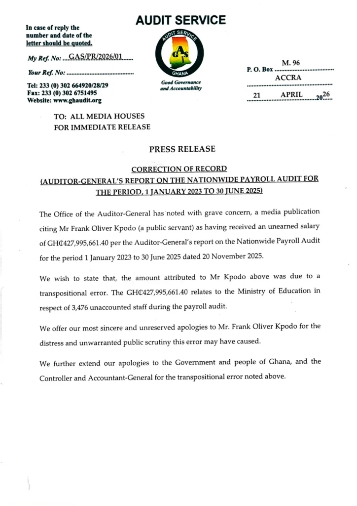 The Office of the Auditor-General has issued a formal apology after an error in its nationwide payroll audit wrongly linked a public servant to an alleged unearned salary exceeding GH¢427 million.
