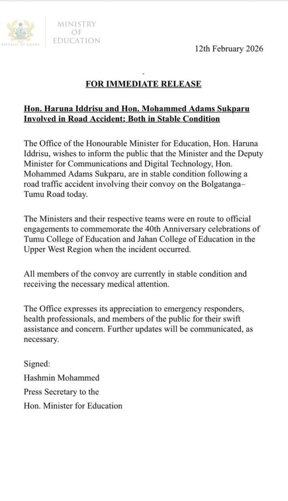 Reports have confirmed that Mr Harruna Iddrisu, Minister for Education and  Mr Mohammed Adams Sukparu, Deputy Minister for Communications and Digital Technology, have been involved in a road accident on Thursday afternoon.