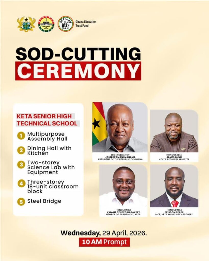 The sod-cutting ceremony, scheduled for Wednesday, April 29, 2026, will be led by the President of the Republic, John Dramani Mahama, alongside key government officials including Mr James Gunu, the Volta Regional Minister, Kwame Dzudzorli Gakpey, the Member of Parliament for Keta, and the Municipal Chief Executive, Wisdom Seade